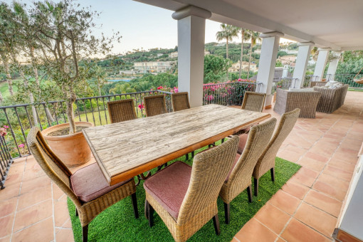 Upon entering, you will find an impressive double height hall with an elegant staircase and a vaulted finish, creating a cozy and upscale atmosphere. The villa has a spacious living and dining room attached to a beautiful south facing covered terrace. On the same floor there are 3 bedrooms each with its own bathroom. The upper level of the villa houses 3 additional bedrooms, each with private terraces offering panoramic views and en-suite bathrooms, ensuring privacy and exclusivity.