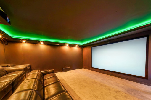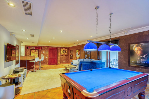 At the garden and pool level, there is a spectacular lounge with bar, pool table, darts and comfortable seating, perfect for enjoying unforgettable moments. The house also includes a spacious fully equipped cinema, ideal for movie nights with family or friends.